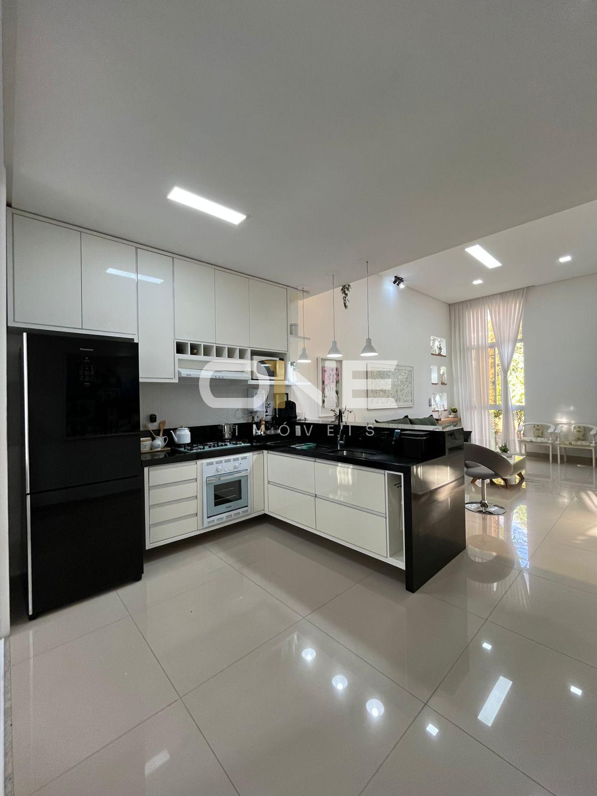 Cozinha integrada com armários planejados, cooktop e forno